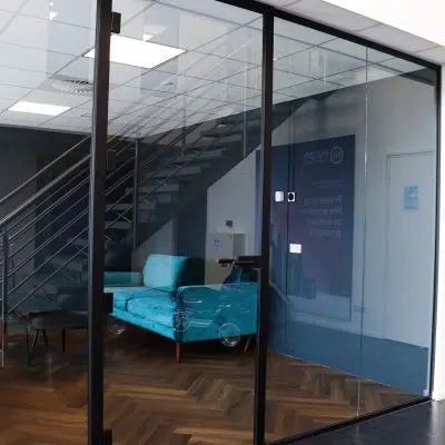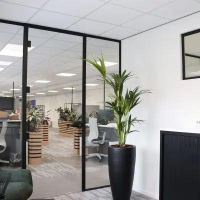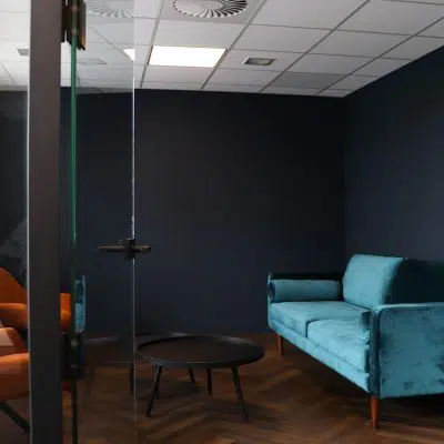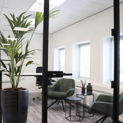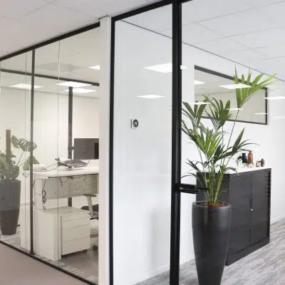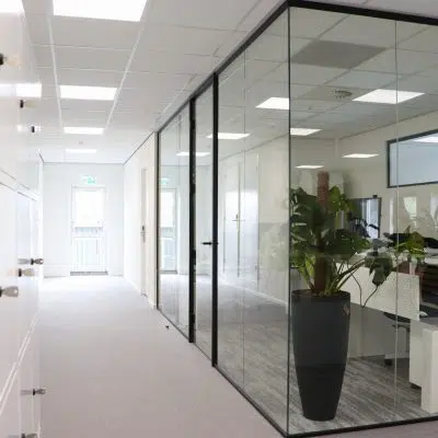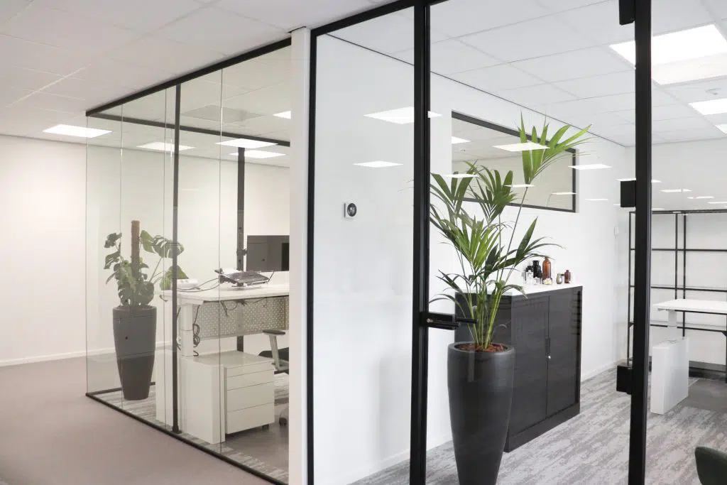 De glazen wanden zijn gemonteerd om de kantoorruimtes te creëren. Deze wanden zijn erg geschikt hiervoor omdat het Silence Glas het geluid tot 35 decibel tegen kan houden. Ook zorgen deze glazen wanden voor een luxe uitstraling. Ze zijn transparant en dat zorgt voor een open uitstraling.
