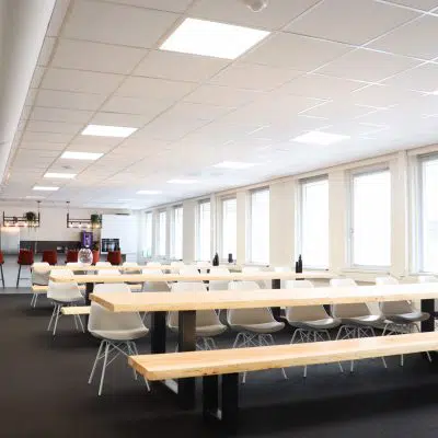 De plafondplaat Rockfon Pallas is geschikt voor ruimtes waar een hogere akoestische kwaliteit gewenst is. Deze plafondplaat voldoet aan de eisen voor brandreactie Euroklasse 1 en is bestand tegen een relatieve vochtigheid van 95%. Er is gekozen voor een helderwitte plaat die het plafond een kwalitatieve uitstraling geeft.
