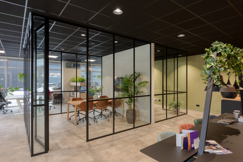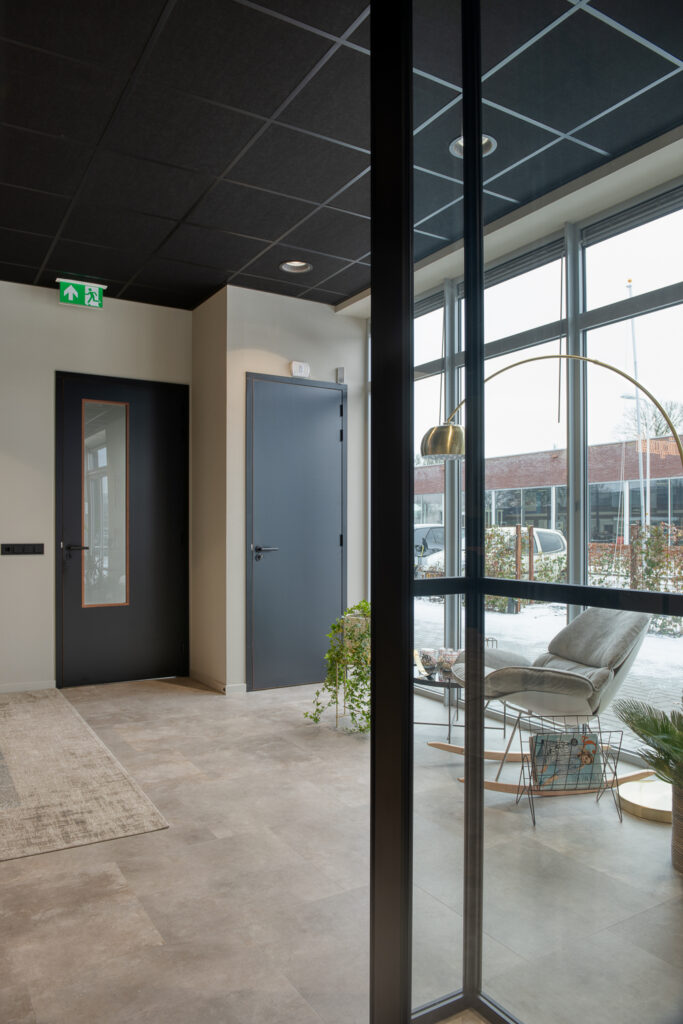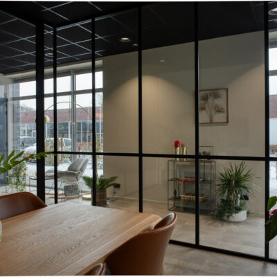Het nieuwe kantoor van Niquell, een nieuwbouwpand op bedrijventerrein De Stadterij in Hoogeveen, werd casco opgeleverd. Met behulp van een ontwerper maakte Niquell een plan voor de inrichting. “Voor de aparte werkruimte en overlegruimte kwamen we op glazen wanden uit. Alleen hadden we bij andere bedrijven wel al gezien en gehoord dat enkel glas niet goed werkt. We hebben contact gezocht met Marvo en aangegeven wat onze wensen waren en dat we vooral goede geluidsisolatie wilden. Ze hebben ons toen deze volglazen wanden aangeraden.” Marvo gaf ook als tip om donkere strips op het glas aan te brengen, zowel verticaal als horizontaal. Een goed idee, vindt Myrthe. “Helemaal glas kan ook mooi zijn, maar het past minder bij ons kantoor. Zeker omdat de gevel ook al volledig van glas is, zou het wel heel erg open worden allemaal.”