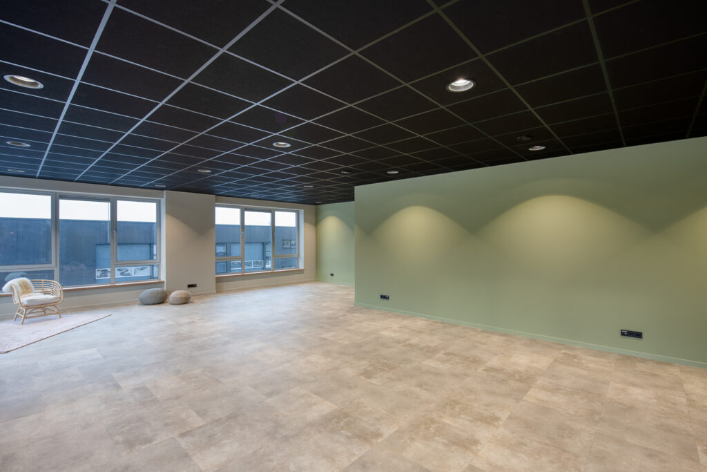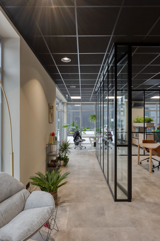 Belangrijk onderdeel in het ontwerp was de kleur zwart, om voor eenheid te zorgen. “Daarom stelde Marvo een zwart systeemplafond voor, dat heeft ook nog eens goede akoestische eigenschappen. Bij de verlichting in het plafond hebben ze ons ook goed geholpen. Ze konden precies aangegeven wat de beste plekken zijn voor de spots en voor de lichtpanelen boven de bureaus.”