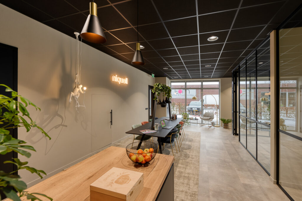 De evenementen en projecten die Niquell organiseert, zijn allemaal op locatie. Maar dat wil niet zeggen dat het op kantoor bij het Hoogeveense organisatiebureau altijd heerlijk rustig is. Sterker nog, met al het telefoneren en overleggen kan het er behoorlijk levendig aan toe gaan. Logisch dus dat geluid een belangrijk aandachtspunt was bij de inrichting van het nieuwe kantoor. “We zaten eerst in een verzamelgebouw, in één kamer”, zegt Myrthe Strijker van Niquell. “Dat werd op een gegeven moment te klein, maar vooral ook te rumoerig. Het maakte goed duidelijk hoe belangrijk goede akoestiek en aparte werkruimtes zijn en dat we daar in ons nieuwe kantoor goede oplossingen voor moesten hebben.” En dat is precies wat Marvo voor Niquell heeft gerealiseerd.