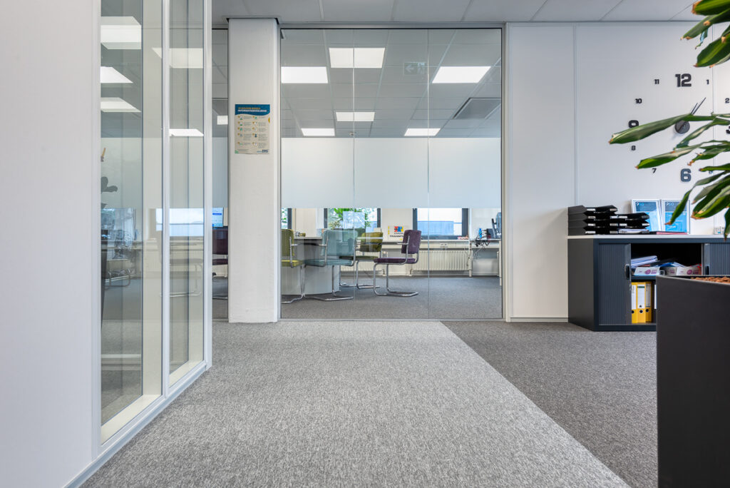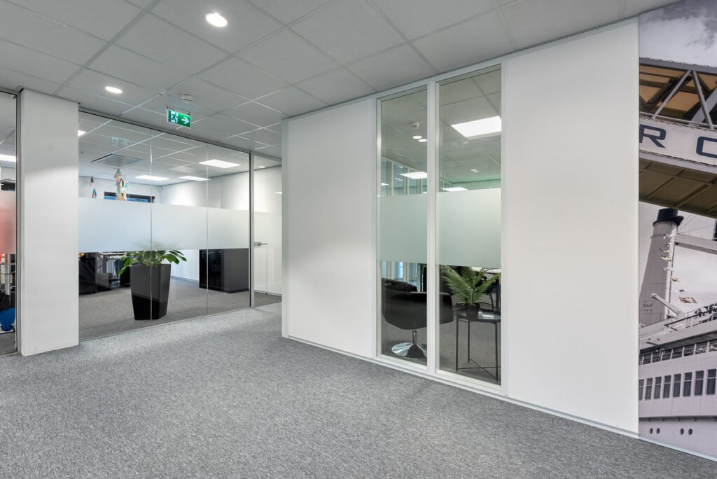 Bij de eerste verbouwing, in 2020, monteerden we ongeveer 100 m2 hardglazen wanden. Deze wanden bestaan uit verticale glazen panelen die tegen elkaar aan worden geplaatst. Tussen de panelen zit een speciale tape die voor een geluiddichte naad zorgt. Alleen aan de onder- en bovenzijde is er een slank aluminium profiel waar de panelen in worden geklemd. Het zorgt voor een heel transparante en open sfeer.