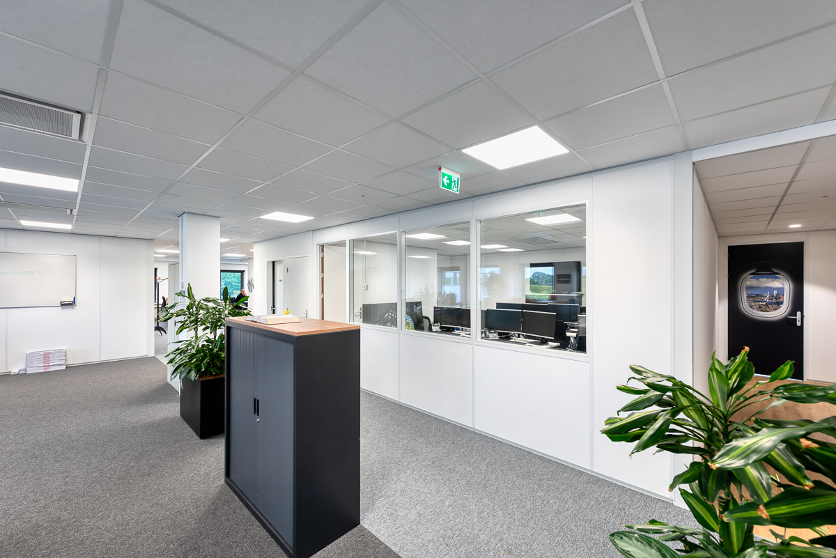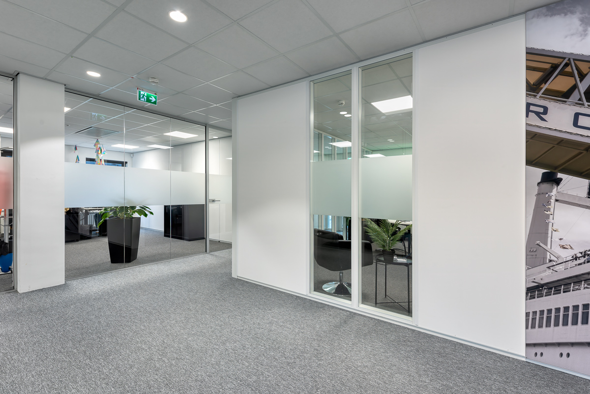 In totaal hebben we ruim 600 m2 gesloten systeemwand gemonteerd. De panelen van deze Obi-100 systeemwand bestaan uit een aluminium kader en een frame dat voor inwendige stevigheid zorgt. De panelen zijn aan beide zijden voorzien van gipsplaten die zijn afgewerkt met vinyl. Doordat de panelen zijn gevuld met isolatiemateriaal, zijn het uitstekende geluidwerende scheidingswanden. De drukschotten die we boven de wanden hebben gemonteerd, zorgen ervoor dat geluid ook bovenlangs niet van de ene naar de andere ruimte kan.