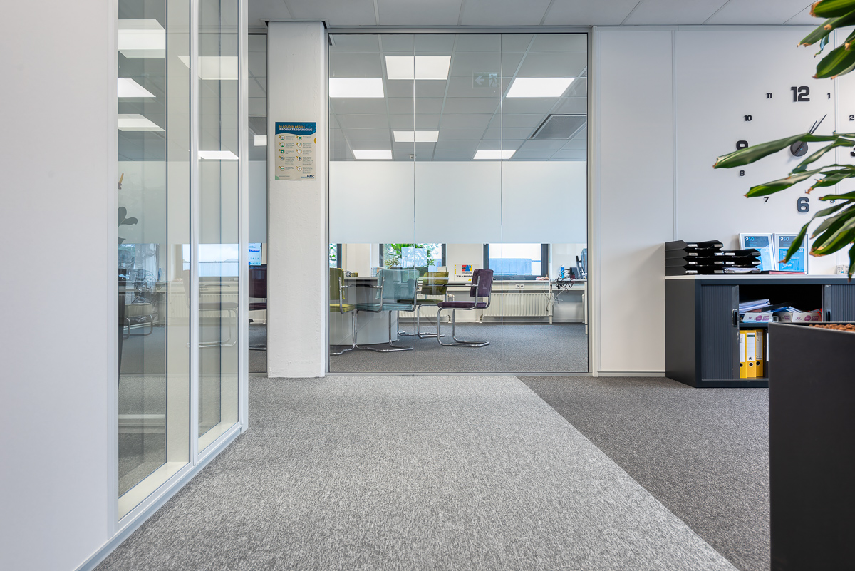 Bij de aanpassingen van de systeemwanden hebben we gesloten panelen van de Obi-wand vervangen door glazen panelen van hetzelfde systeem. In de glaskozijnen van vloer tot aan het systeemplafond zit dubbel glas. Bij het leslokaal hebben we zogeheten middenvensters van het Obi-wandsysteem gebruikt. Met vinyl afgewerkte gipsplaten zorgen voor een dichte borstwering van 1 m hoog, daarboven is de wand voorzien van dubbel glas tot aan het systeemplafond