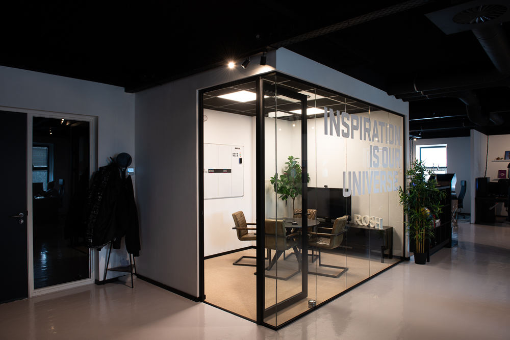 Sinds de oprichting is ROSH Studios snel en flink gegroeid, in 6,5 jaar tijd ging het van 2 naar 20 mensen. Er was dan ook hard grotere werkruimte nodig. Die vonden ze op de bovenste verdieping van een nieuw gebouwd kantoor. De creatievelingen maakten zelf van A tot Z het plan voor de inrichting van de 400 m2 grote kale ruimte. “We wilden het industrieel houden, met moderne kleuren zoals zwart, goud, wit en grijs en veel transparantie. Veel glazen wanden dus en liefst geen systeemplafond omdat dat minder goed bij ons past”, zegt Koen Arens van ROSH Studios. Marvo plaatste een kleine 60 m2 glazen wanden, 25 m2 metalstud wanden en 20 meter metalstud koven. En toch ook een systeemplafond, in een bescheiden vergaderruimte van 11 m2. Reden dat ROSH Studios Reclamebureau daar toch voor een systeemplafond koos, was de airco-unit aan het plafond. “Die wilden we uit het zicht hebben, en we wilden geen last hebben van het geluid. Marvo maakte duidelijk dat de beste oplossing een systeemplafond zou zijn. Ook prijstechnisch, én omdat het voor een goede akoestiek zorgt. Gelukkig kon het in het zwart!”