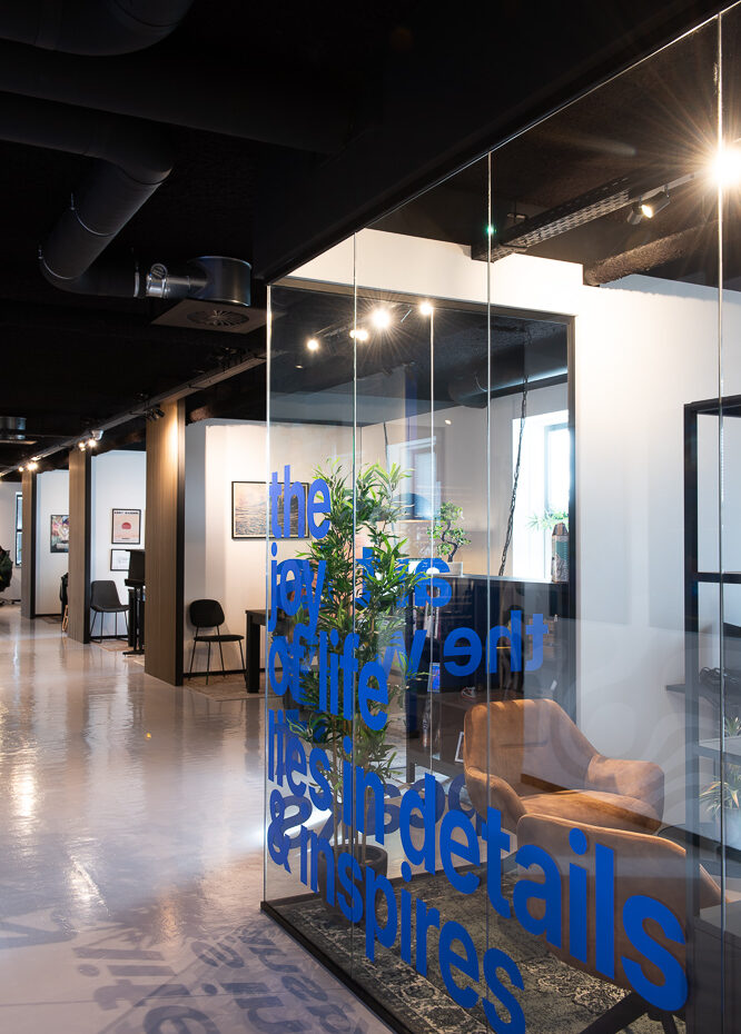 De meeste werkplekken zijn in de open ruimte, maar met volglazen wanden zijn twee afgesloten werkplekken en twee besloten vergaderruimtes gecreëerd. Volglazen wanden bestaan uit meerdere verticale glazen panelen die tegen elkaar aan worden geplaatst. Tussen de glazen panelen zit dus geen profiel, maar alleen een speciale tape die voor een geluiddichte naad zorgt. Slechts aan de onder- en bovenzijde is er een aluminium profiel waar de wand in wordt geklemd. Die profielen zijn zo slank dat ze nauwelijks opvallen. Zo zorgt een volglazen wand voor een maximale transparantie en een rustig en strak beeld. Perfect voor elke inrichting.