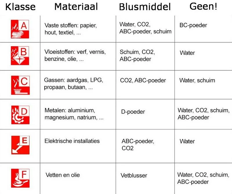 Elk van deze brandklassen heeft zijn eigen specifieke blusmiddel waarmee de brand het beste kan worden bestreden. Dit wordt ook meestal op de brandblussers aangegeven met een symbool. Water mag bijvoorbeeld alleen gebruikt worden voor vaste stoffen naast CO2-, poeder- en schuim-blussers en nooit voor de andere brandklassen.