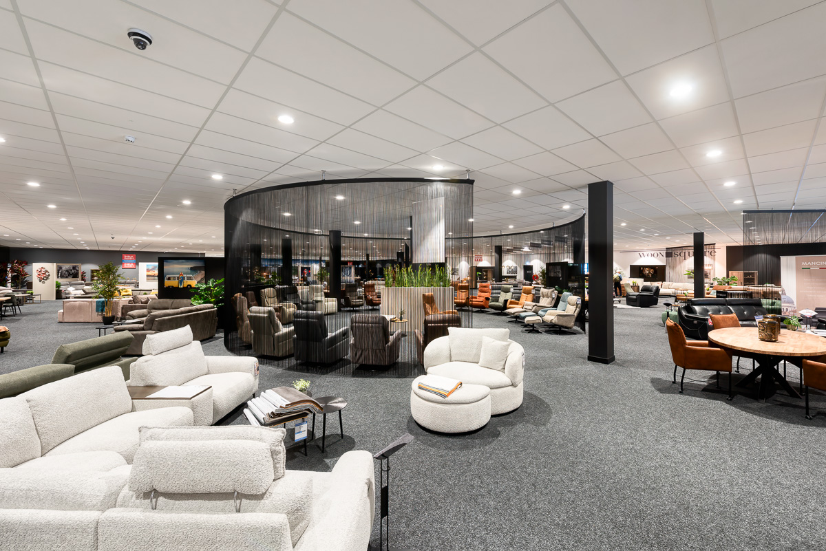 Een systeemplafond is een belangrijk onderdeel van de winkelinrichting, weten ze bij Woonsquare. Zo’n groot pand bevat immers een heleboel leidingen voor verlichting, luchtverversing, camerasystemen, bewegingsmelders, rookmelders enzovoorts. Al die techniek en al die kabelgoten wil je niet in het zicht hebben, maar het moet wel allemaal bereikbaar zijn. Daarvoor is een systeemplafond een ideale oplossing. Daarnaast wil Woonsquare een bepaalde uitstraling in de winkels en daar draagt een goed systeemplafond aan bij, legt een woordvoerder van het bedrijf uit. “Het plafond moet sfeer hebben, strak zijn en vooral niet afleiden van de producten die eronder gepresenteerd worden; onze meubels dus.”